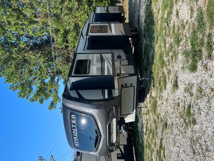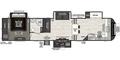 Aluminum building materials with fiberglass siding – 1 door entry – 2 AC units – 2 axles – 1 awning – sleeps 4 – 4 slides – large front kitchen with a 3-burner stove/oven – microwave – residential-size fridge – plenty of cabinets and drawers – full-size pantry – bar-type table setting.