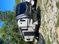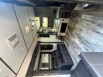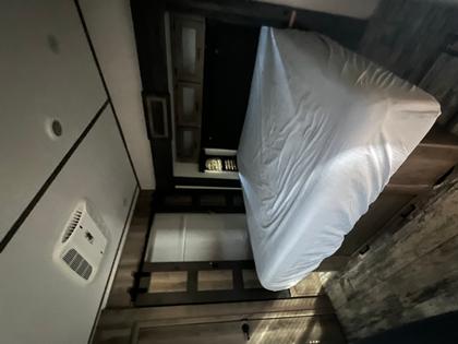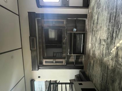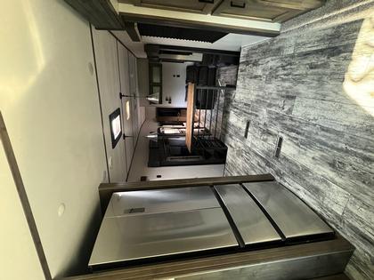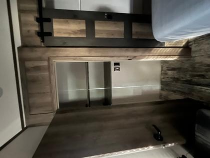 The bedroom boasts a king-size bed with a pull-out pet bed at the end, 2 full closets (one with washer/dryer connections), and a full dresser. The RV has beautiful flooring throughout.
