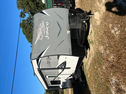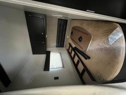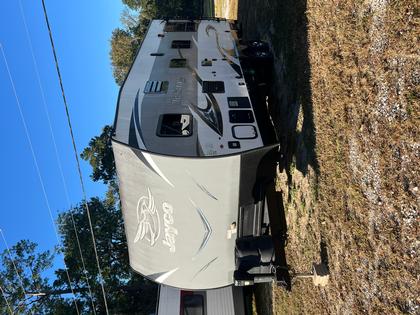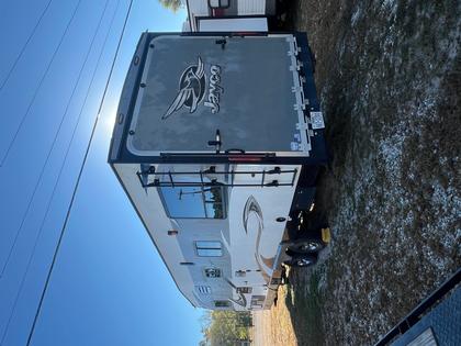 This toy hauler travel trailer that can sleep up to 8 people, has a garage area measuring 17 feet 6 inches and a cargo capacity of 3865 pounds.