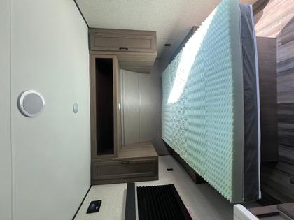 The bath area is designed with a shower, a cabinet under the sink, and a large wardrobe, offering plenty of storage space. The full-size bed includes storage on both sides as well as underneath, and pleated night shades add to the comfort and privacy of the sleeping area.