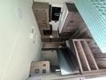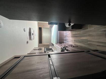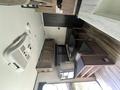 The center kitchen is equipped with a two-burner stove, microwave, and a mid-size refrigerator. There is ample cabinet space for all your storage needs. The booth table features overhead storage and can be converted into a bed, providing flexible sleeping arrangements.