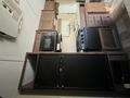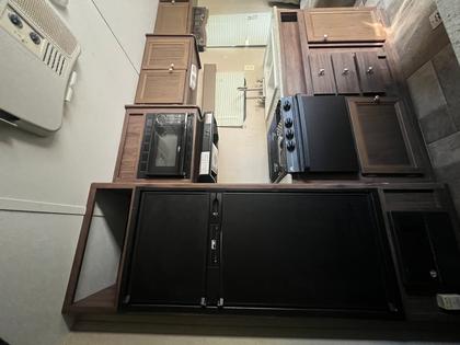 - Kitchen: Center kitchen with a three-burner stove and oven, microwave, and mid-size refrigerator